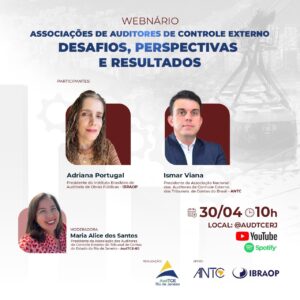 A presidente do Ibraop, Adriana Portugal, foi convidada pela Associação dos Auditores de Controle Externo do Tribunal de Contas do Estado do Rio de Janeiro (AudTCE-RJ) a participar do Webinário intitulado “Associações de Auditores de Controle Externo: Desafios, Perspectivas e Resultados”. O evento online irá ao ar no dia 30 de abril, em homenagem ao Dia do Auditor de Controle Externo, data comemorada no sábado anterior, dia 27 de abril.