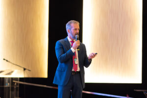 O gerente nacional de Padronização e Normas da CAIXA, Rodrigo Gorski, foi o primeiro a se apresentar com a palestra “Muito Além do FGTS”, onde demonstrou o papel do banco como parceiro no desenvolvimento nacional. Ele detalhou a estrutura da equipe VIGOV CAIXA por regiões do Brasil e a composição da rede executiva de governo, ilustrando a distribuição de seus empregados.