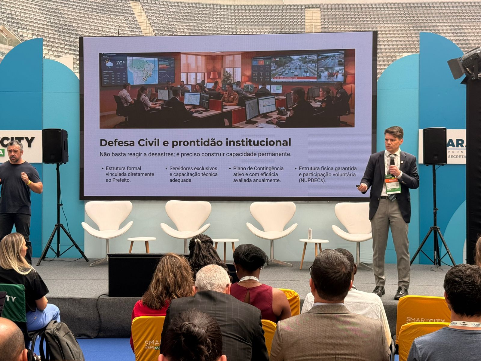 Durante a sessão “Innovation Stage”, que debateu a inovação como política pública nos municípios paranaenses, Adriana prestigiou a apresentação feita pelo presidente do Tribunal de Contas do Estado do Paraná (TCE-PR), conselheiro Ivens Linhares. Em sua fala, o conselheiro destacou a importância da articulação entre governos, órgãos de controle e ecossistemas de inovação, ressaltando a necessidade de fortalecer a governança, a transparência e a segurança jurídica na adoção de soluções inovadoras, além do papel estratégico da tecnologia na modernização da administração pública.