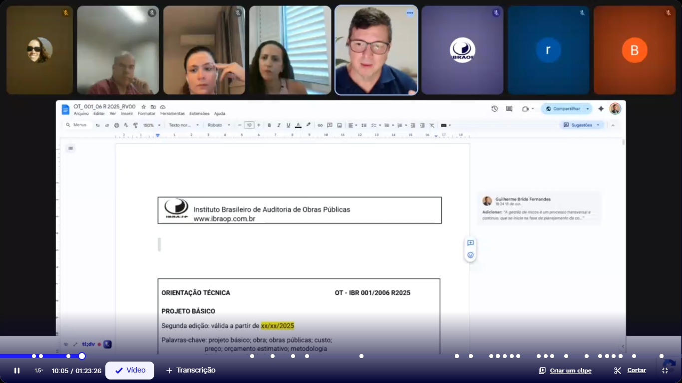 Atém de Guilherme, esse grupo de trabalho é composto pela presidente Adriana Portugal (TCDF), pela diretora Técnica Adjunta Éricka da Silva Cândido (TCM-GO), e pelos diretores de Eventos Júlio Uchoa Cavalcanti Neto (TCE-PB), de Planejamento Adjunto Douglas de Oliveira (TCE-MG) e de Relações Institucionais Adjunto do Ibraop, Bruno Malaquias (TCE-GO).